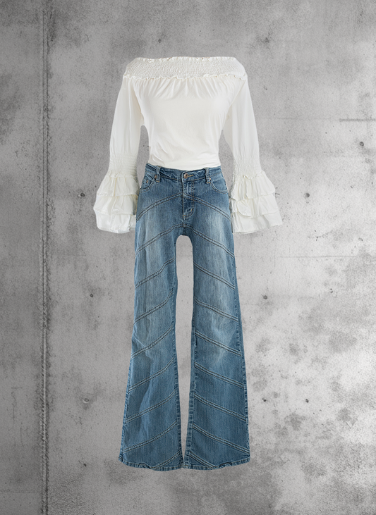 frills and flairs- a -drop shoulder blouse and low rise flair jeans